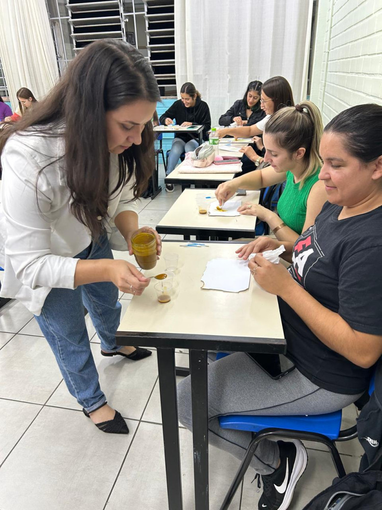 A atividade, conduzida pela professora Silviani T. Poma, proporcionou um momento de diálogo e troca de conhecimentos, aproximando os conteúdos estudados em aula da realidade da prática docente.