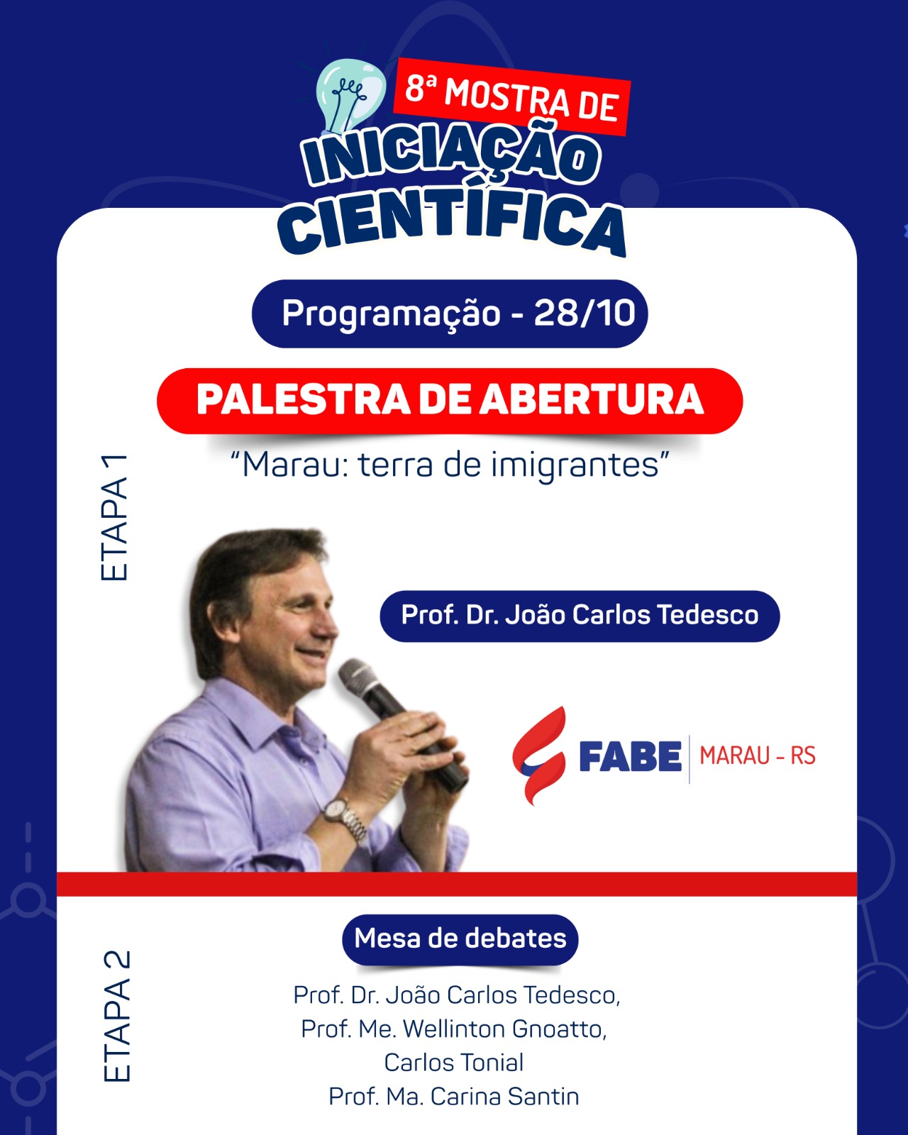 O encontro contará com a presença doProf.Dr. João Carlos Tedesco, professor e pesquisador da Universidade de Passo Fundo (UPF), doutor em Sociologia pela Universidade de São Paulo (USP) e com pós-doutorado pela Universidade Federal do Rio Grande do Sul (UFRGS), cuja trajetória acadêmica e científica lhe confere ampla autoridade para analisar os efeitos sociais, políticos e econômicos das migraçõesatuais na sociedade.