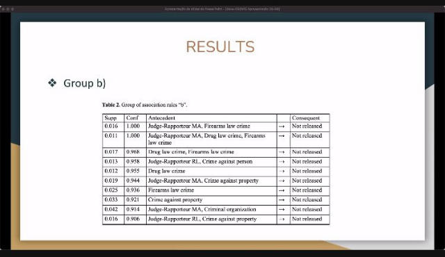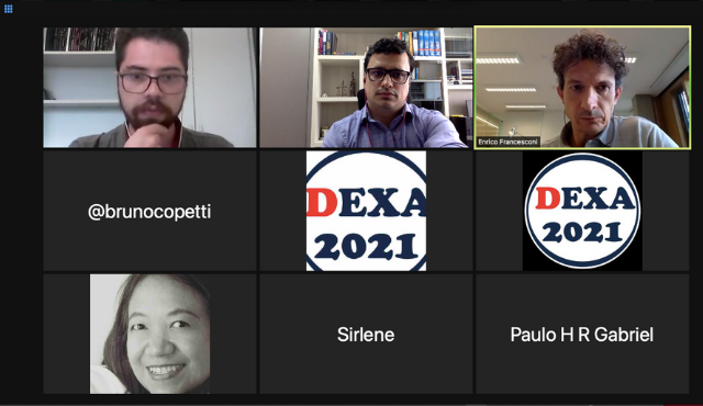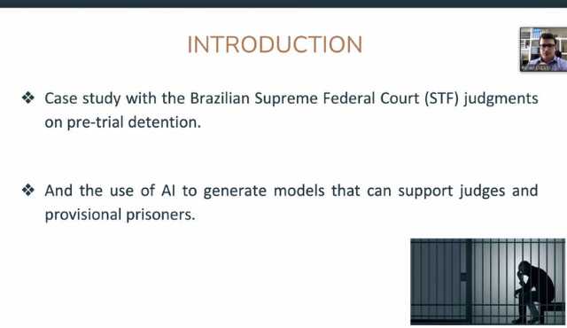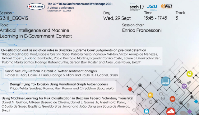 Na sessão destinada ao EGOVIS 2021, a qual abordava a temática da Inteligência Artificial (IA) e Aprendizado de Máquina no contexto do Governo Eletrônico, o professor Rafael, juntamente com Thiago Raulino Dal Pont, apresentou o artigo intitulado “Classification and association rules in Brazilian Supreme Court judgments on pre-trial detention”. A coordenação da mesa ficou a cargo do professor Dr. Enrico Francesconi, do Instituto de Teoria e Técnicas de Informação Jurídica de Florença, na Itália.